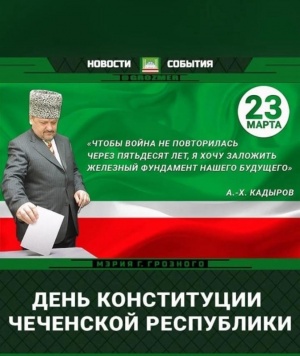 Добрый день, дорогие друзья! От имени коллектива Д/с√3 с. Ахмат-Юрт и от себя лично поздравляю Главу Чеченской Республики, Героя России Рамзана Ахматовича Кадырова и в его лице всех жителей республики с Днём Конституции ЧР. В этот знаменательный день, 23 марта 2003 года, чеченский народ, руководствуясь принципами и идеалами своего национального лидера, Ахмата-Хаджи Кадырова (Дала г1азот къобал дойла цуьнан!), путем общенародного референдума выбрал путь мира и согласия на родной земле. Это желание воплотилось в Конституции Чеченской Республики - основополагающем документе, определяющем стремление народа жить и развиваться плечом к плечу с Российской Федерацией.